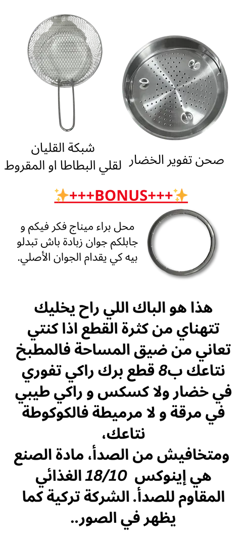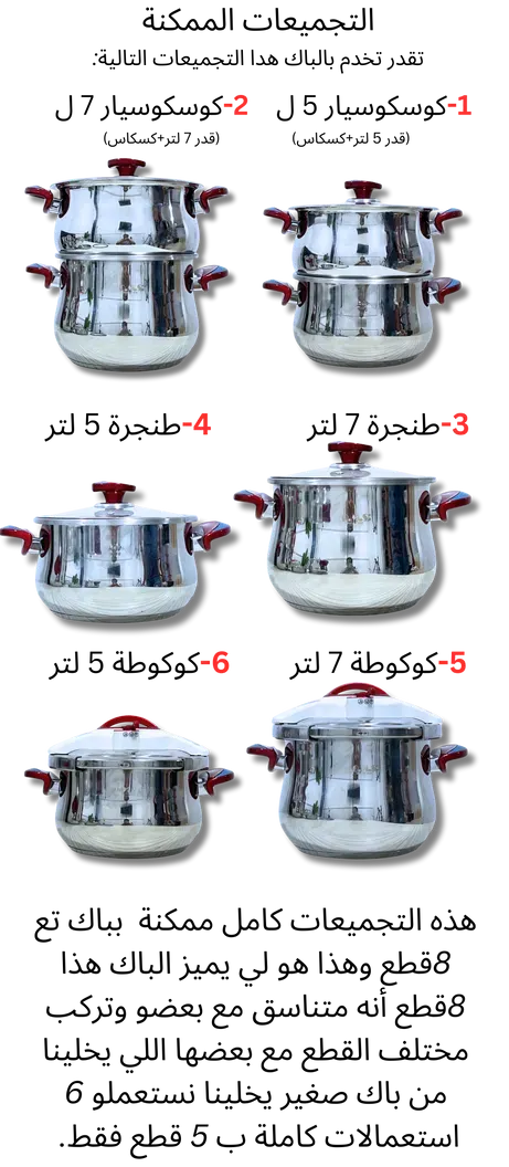 كوكوط 8 قطع ✅كوككوط 7 لتر + ✅غطاء للكوكوط يركب عليهم في زوج + ✅ كسكاس +✅ شبكة القليان +✅ غطائ زجاجي ✅ جوان اضافي + كسكاس الخضر