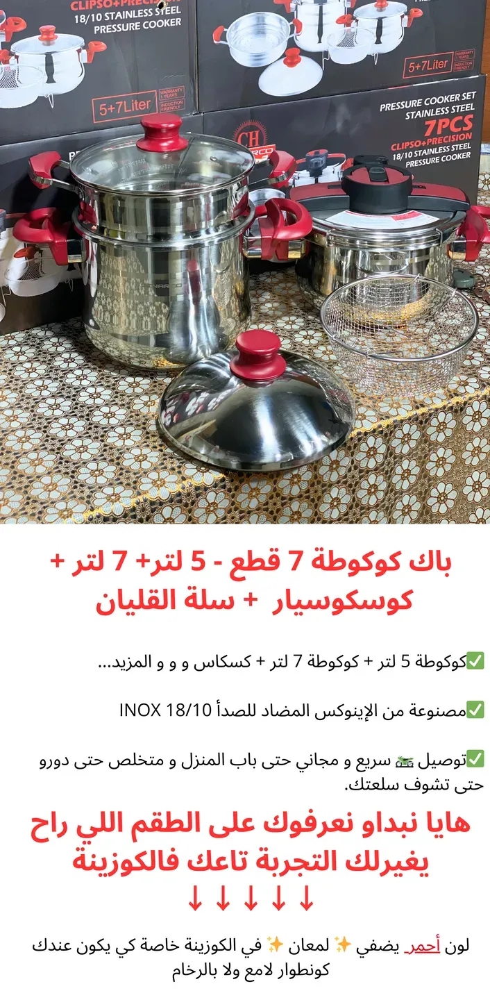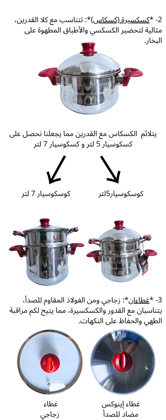 كوكوط 7 قطع زوج كوكوطات 5 لتر و7 لتر كسكاس غطائين واحد زجاج وواحد ايونكس زائد شبكة القليلن لترفد اكثر من واحد كيلو غرام مصنوعة من الاينوكس 18/10 اليمونتار 100%