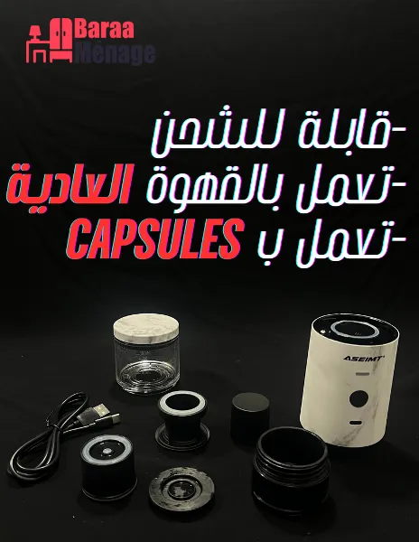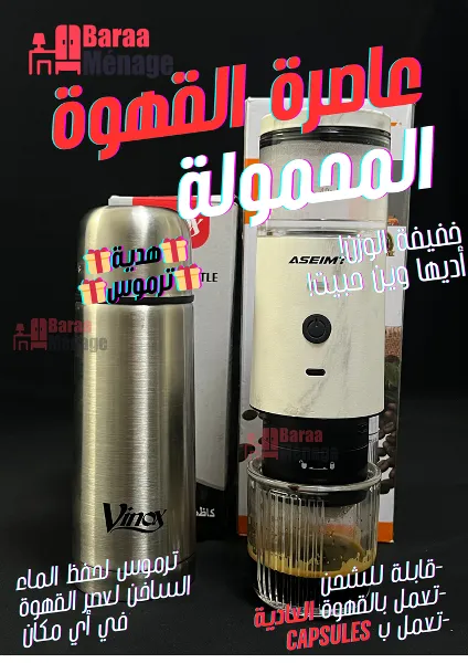 ماكنة قهوة محمولة قابلة للشحن تستعمل اثنين في واحد تستعمل عن طريق القهوة العادية او تستعمل عن طريق الكابسيل مع الترموس التي تأتي معها كهدية يمكنك عصر القهوة في أي مكان أو حفظ القهوة ساخنة و استهلاكها في أي وقت طريقة العمل انتاعها جد سهلة وسريعة بكبسة زر واحدة وفي اقل من 20 ثانية قهوة نظيفة وبنة خرافية