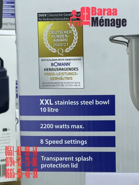 متوفرة في حجمين الحجم الاول XXL stainless steel bowl 10 litre ----- 2200 watts max. 8 Speed settings Transparent splash protection lid الحجم التاني stainless steel bowl 7 litre 1600 watts max 10 Speed settings Transparent splash protection lid النوعين 3في واحد